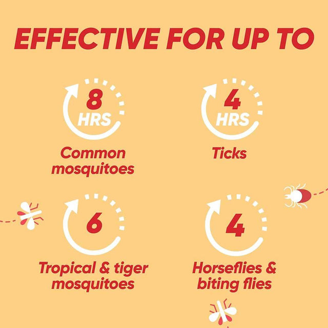 - Offers up to 8 hours of protection (up to 4 hours of ticks and up to 5 hours of stinging flies, 6 hours against the tiger mosquito)