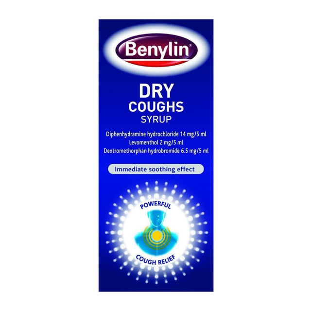 Benylin Dry Coughs Syrup helps to relieve dry irritating coughs. The active ingredient dextromethorphan helps to stop persistent coughing. The syrup also contains diphenhydramine hydrochloride an antihistamine which helps to stop sneezing, runny nose and watery eyes and levomenthol to help breathe more easily by relieving congestion.
