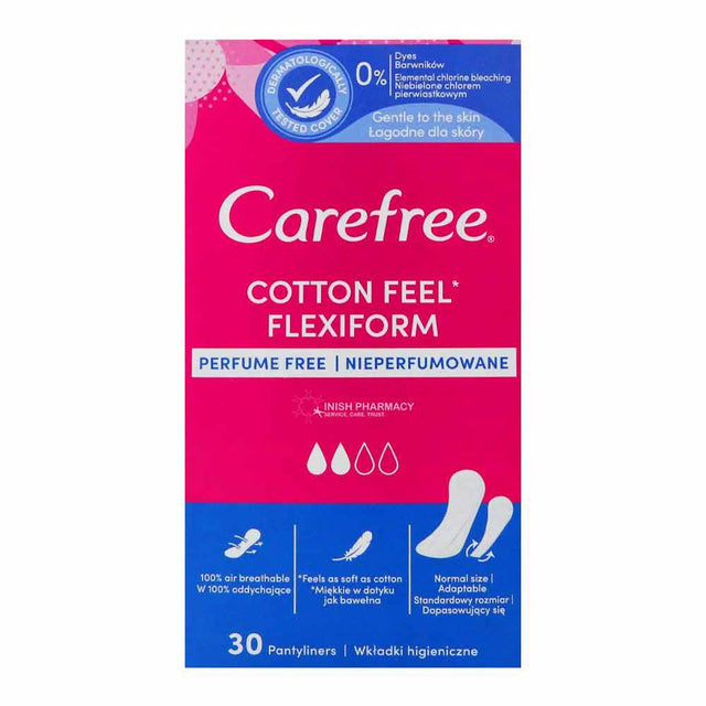 The Carefree Cotton Feel Flexiform Pantyliners are 100% air-breathable and offer a typical soft cotton feel.