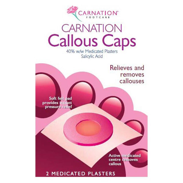 Carnation Callous Caps have been designed to help alleviate friction and pain caused by callous. These caps are comfortable and medicated plasters that are self-adhesive. They penetrate and remove callouses while the felt ring relieves pressure.
