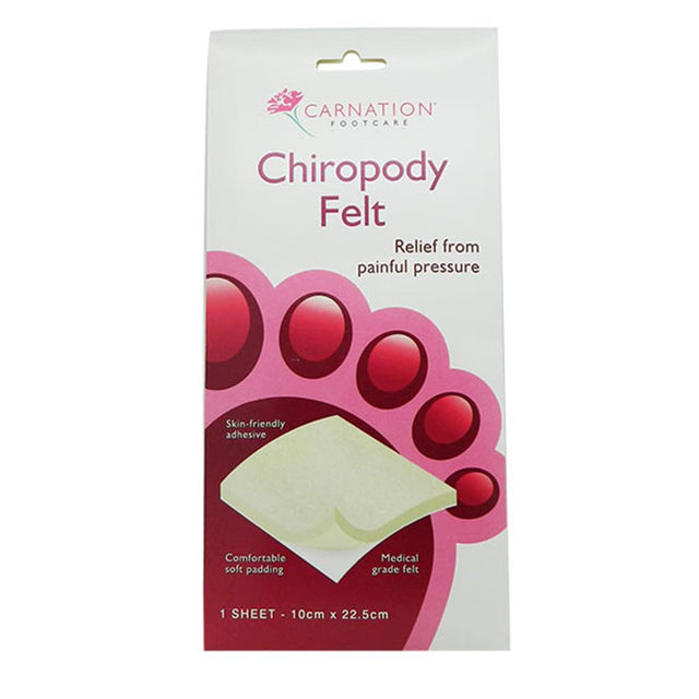 Carnation Chiropody Felt Sheet can be cut to different sizes and shapes. This soft padding is hypo-allergenic and creates pressure pads, arch support and relief from friction. The skin friendly padding also provides relief from calluses and bunions by redistributing pressure to reduce the impact and trauma to the foot.