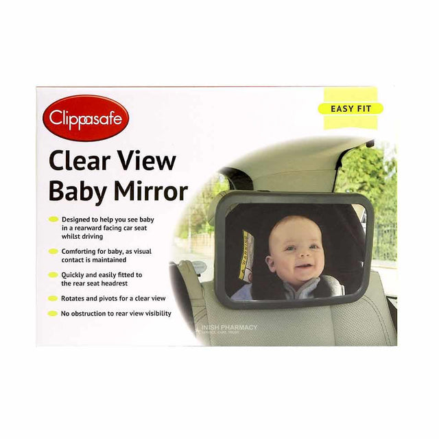 The Clippasafe Clear View Baby Mirror (Large) is designed to provide parents with a wide and clear view of their rear-facing child while driving. Its large mirror surface offers a safe and reliable way to monitor your baby without turning around, helping you stay focused on the road. The mirror is easy to install with adjustable straps that securely attach to most vehicle headrests, ensuring a stable and unobstructed view.