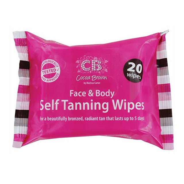 The Cocoa Brown Face & Body Self Tanning Wipes have been designed by beauty expert Marissa Carter. These tanning wipes are the easy way to maintain or top up your tan for a golden bronzed look that lasts up to 5 days. They are perfect to use on both your hands and face, as well as touching up your legs and arms. The Cocoa Brown tanning wipes include 20 wipes per pack and they are perfect for travelling with.