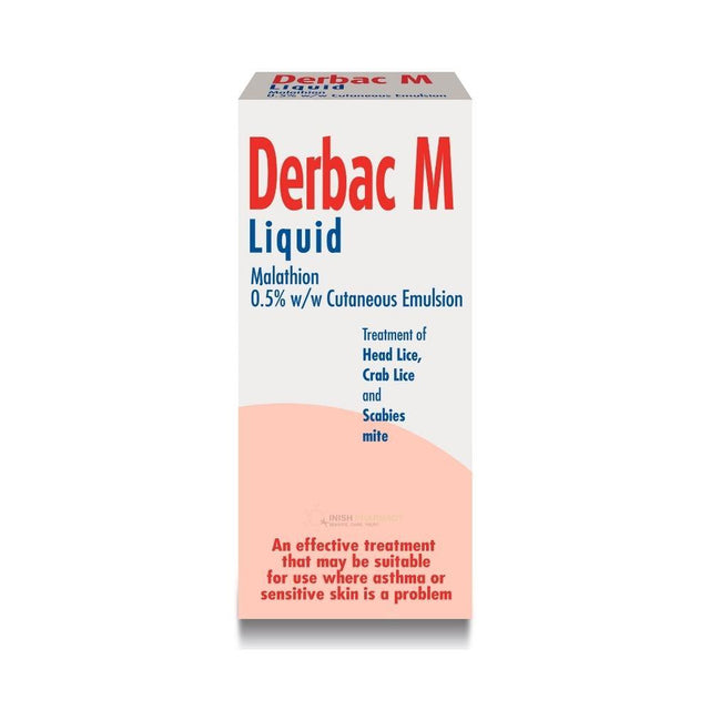 Derbac M Liquid is an effective treatment for head lice, pubic lice (crab lice), their eggs and in the treatment of scabies. The active ingredient in this medicine is Malathion 0.5% w/w.