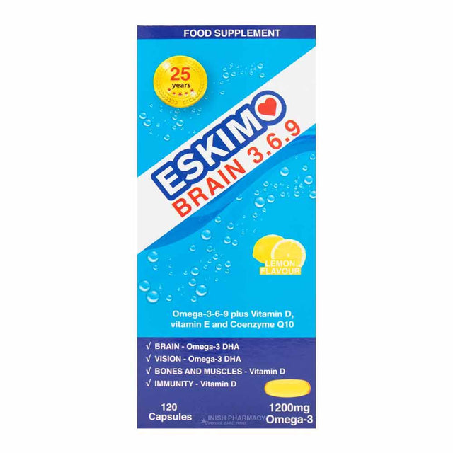 Eskimo Brain 3.6.9 helps support healthy brain function, vision, mind and exam support. These capsules combine the unique stable fish oil, Eskimo-3, with ingredients such as CoQ10 and GLA to optimize brain and energy support. Omega-3, 6 and 9 plus vitamin E, vitamin D and Omega-3 including 400mg Omega-3 DHA for healthy brain function and vision. Vitamin D contributes to normal bone, tooth and muscle function plus a strong and effective immune system. Eskimo-3 always uses reliable, sustainable fishing sources and has a Friend of the Sea Certification.