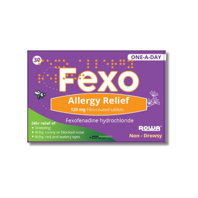 Fexo Allergy relief contain the Fexofenadine 120mg, an effective once-daily, non-drowsy antihistamine. Fexo Allergy relief are used for the relief of symptoms of hay fever (seasonal allergic rhinitis) such as sneexing, runny nose, blocked nose or eye symptoms such as ithcy, red and watery eye.