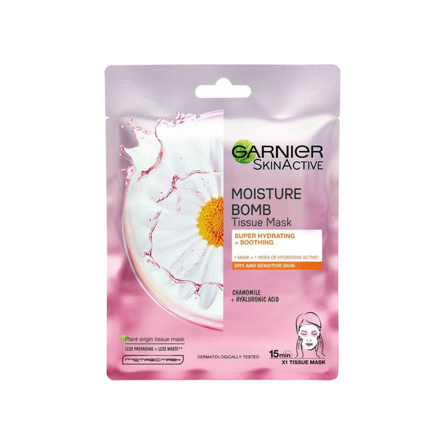 Garnier Moisture Bomb Hydrating Sheet Mask is a super hydrating, revitalising and soothing tissue mask for nourished soothed skin. This Chamomile face mask intensely hydrates, comforts and soothes, for skin that feels softer & smooth. Your skin will be left feeling and looking smoother & healthier in 15 minutes.