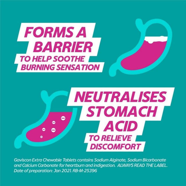 Gaviscon Extra Chewable Tablets are a convenient way to treat heartburn and indigestion. Each chewable tablet helps you treat symptoms fast and when you need to. Gaviscon Extra combines two antacids and an alginate