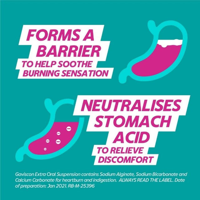 Gaviscon Extra Oral Suspension is suitable to treat heartburn and indigestion. This 150ml size is perfect to keep with you on the go so you can treat symptoms fast and when you need to. Gaviscon Extra combines two antacids and an alginate