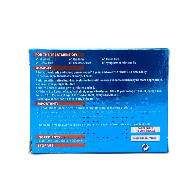 These Paracetamol Tablets are an effective pain relief medication containing paracetamol. Paracetamol tablets fight against pain such as headache, muscle pain, backache, toothache and period pain. This medication also reduces fever and pain associated with colds and flu, migraines, dental pain, headaches, period pain or rheumatic pain.