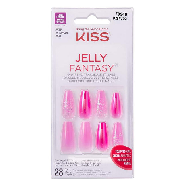Kiss Gel Fantasy Jelly Nails- Jelly Baby are long-length translucent nails with a pink glitter design. These sculpted nails are ready to wear and are easily applied with adhesive tabs or glue.