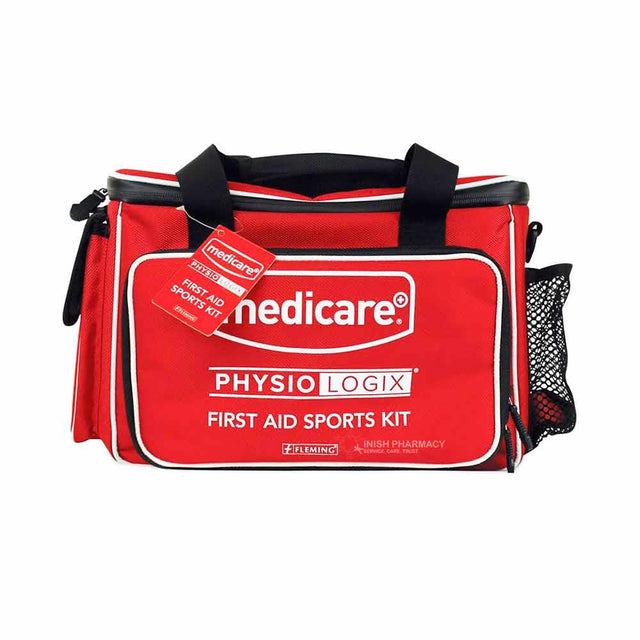 The Medicare Physiologix First Aid Sports Kit contains all the essentials needed to treat a minor injury on the playing field. Suitable for all sports applications. Features: - Waterproof run-on bag - One main compartment with front and side pockets and water bottle holder - Contains a variety of dressings, tapes, bandages and cold therapy items for treating minor sports injuries.
