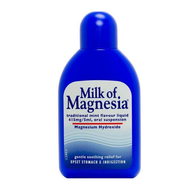 Milk of Magnesia liquid is an oral suspension of 415mg Magnesium Hydroxide per 5ml. It provides gentle soothing relief for upset stomach and indigestion with a tasty mint flavour. Milk of Magnesia can also be used to relieve constipation.