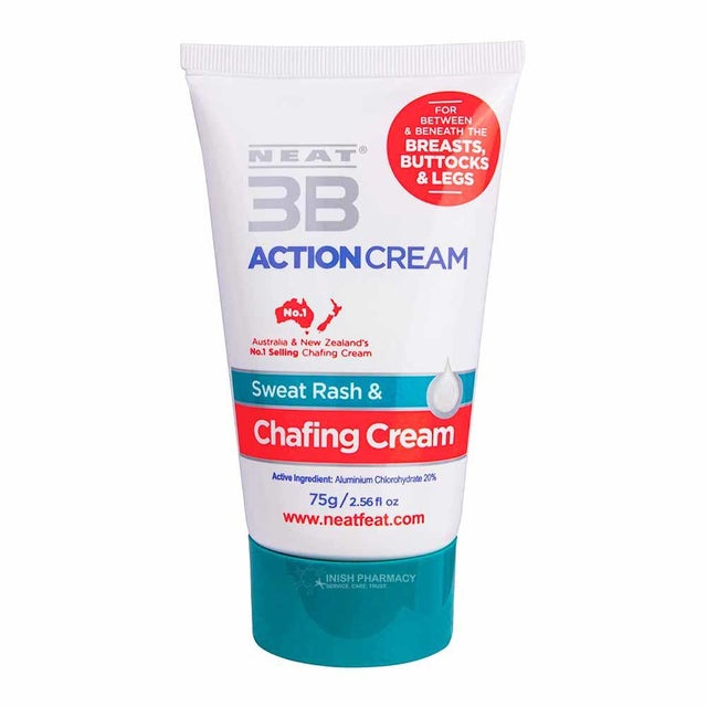 Neat 3B Action Cream is designed to help prevent sweat rash and chafing that can occur between the legs, buttocks, and breasts. Suitable for athletes, hikers or sports people who experience these issues. The action cream works by removing any moisture from the skin.
