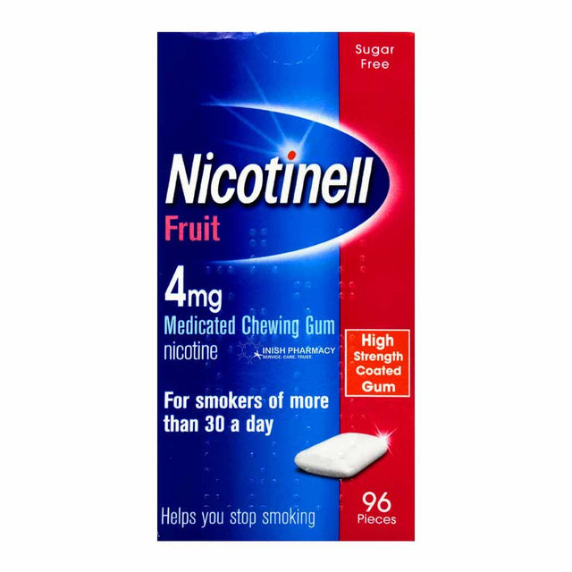 Nicotinell 4mg Gum is used to help smokers to stop smoking. The gum contains 4mg of nicotine which is released slowly into the body through the mouth when chewed to help combat the craving associated when giving up cigarettes. This Nicotine Replacement Therapy (NRT) is fruit flavoured and can relieve withdrawal symptoms associated with nicotine dependency.