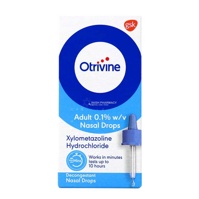 Otrivine Adult Nasal Drops 0.1% are used to relive nasal congestion, blocked sinuses and stuffy nose associated with colds, flu and allergies. The active substance is xylometazoline hydrochloride which opens and clears the nasal passage by reducing the excessive nasal secretions and returning the swollen blood vessels to their normal size.