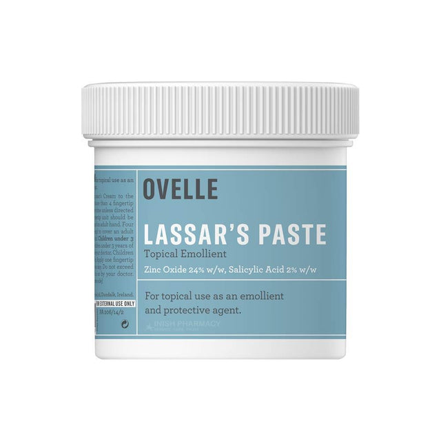 Ovelle Lassar’s Paste contains Zinc Oxide 24% w/w & Salicylic Acid 2% w/w. Ovelle Lassar’s Paste is for topical use as an emollient and protective agent.
