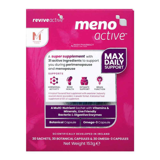 Meno Active is the new and improved menopause Super Supplement with a scientifically formulated blend of 31 active ingredients, delivered in a combination of a sachet, an Omega-3 capsule and a botanical capsule.