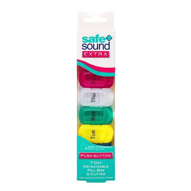 The Safe & Sound Push Button 7 Day Detachable Pill Box is an ideal way of keeping track of daily medication and vitamins. Also included is a handy detachable pill cutter.