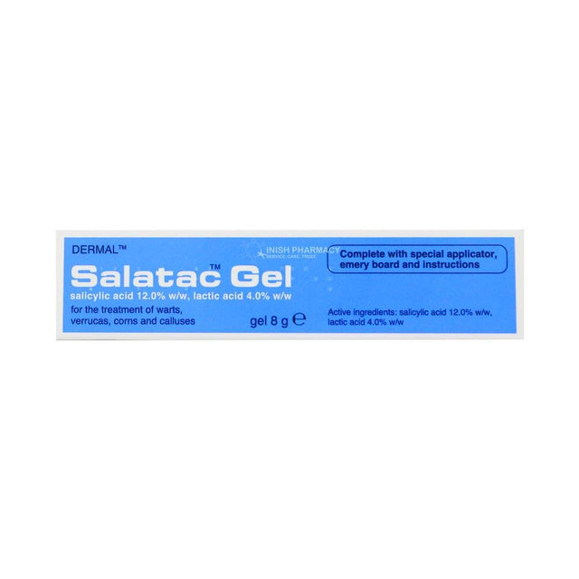 Salatac Gel is a pharmacy strength product designed to treat warts, veruccas, corns and calluses. It contains both Salicylic Acid 12% and Lactic Acid 4%.