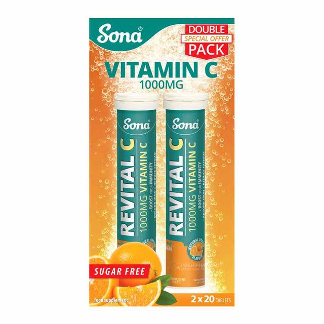 Sona Revital C 1000mg Vitamin C is an orange flavoured supplement that has been formulated to help support the immune system and reduce tiredness & fatigue. This sugar free supplement also helps with the normal function of blood vessels, bones, cartilage skin and teeth.
