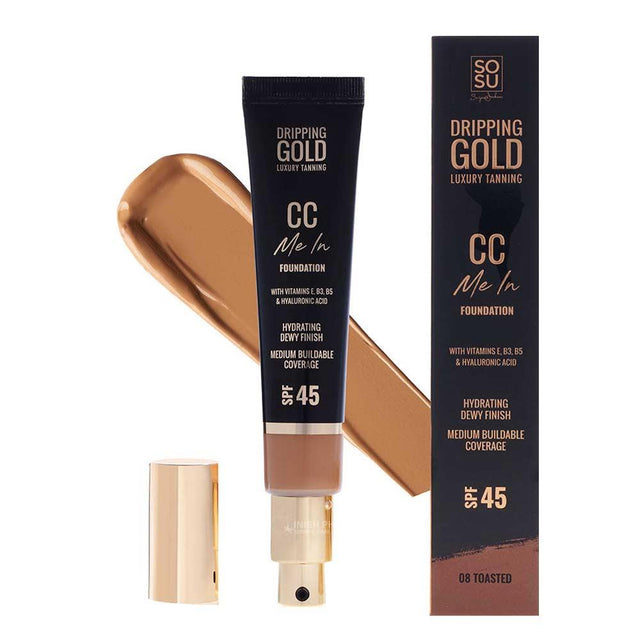 The SOSU Dripping Gold CC Me In Foundation in the shade 08 Toasted is a weightless, liquid foundation that is loved by many. This foundation offers medium to buildable coverage making it perfect for both day and night looks. It also has Hyaluronic Acid & SPF45 to protect your skin and will leave your skin hydrated with a natural dewy finish.